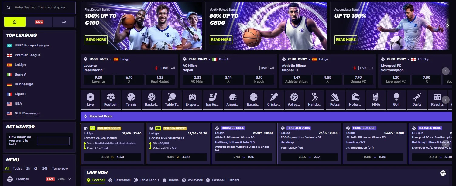 Sportuna combines top European leagues, in-play betting, virtual competitions, and interactive tools into one modern betting platform. The site covers football, basketball, tennis, table tennis, esports, and much more, while also offering unique features such as the Bet Mentor strategy tool, customizable odds formats, and a loyalty shop where players can exchange coins for free bets.